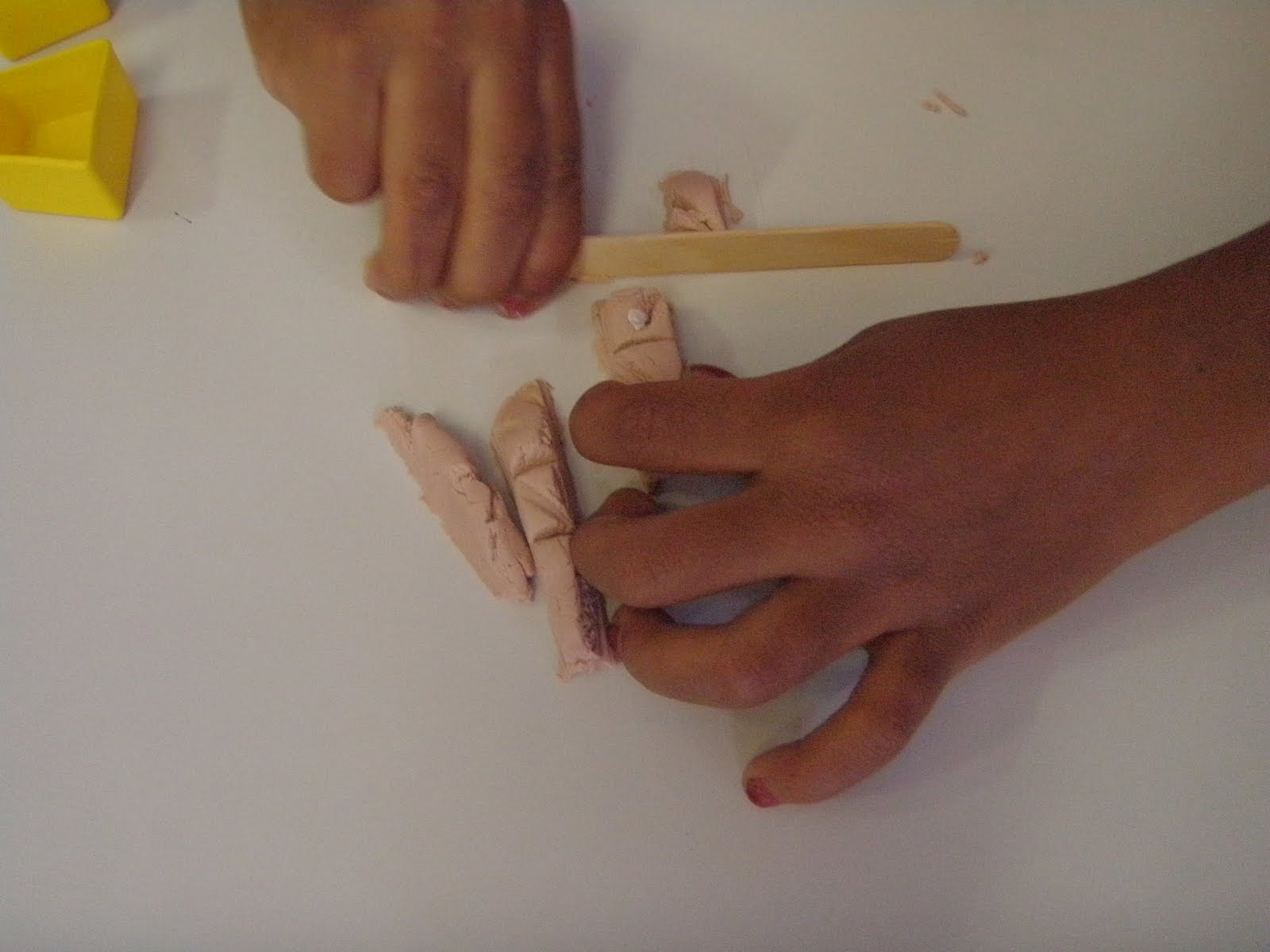-Para membros ou partes duplas entregar uma porção minúscula e pedir que façam uma cobrinha e dividam em duas partes para os braços; fazer o mesmo com olhos, orelhas, pernas ou calças, sapatos etc