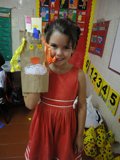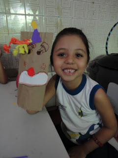 Já em sala com muita disposição,saco pardo e papéis de montão montamos um lindo fantoche a alegria saltava ao coração enquanto a arte fluia cantavamos uma canção.