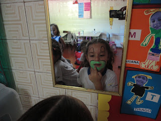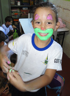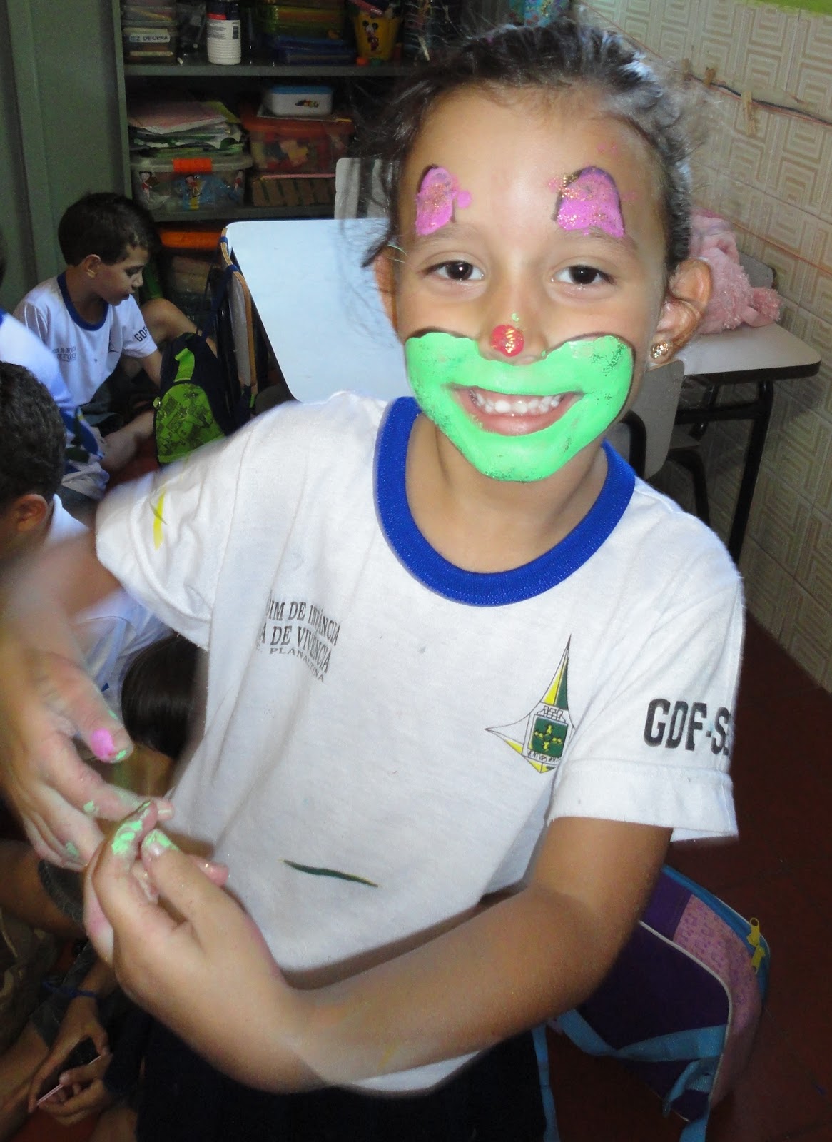 Como ainda havia tinta e disposição continuamos fazendo arte com as próprias mãos.A tia deu uma ajudinha desenhou com lápis de olho o contorno da sobrancelha e da boca do palhaço em nosso rosto. O resto foi por nossa conta...com espelho,os dedinhos e tinta para rosto foram surgindo pouco a pouco os palhaços mais lindos do mundo!!A cada cor uma nova emoção!