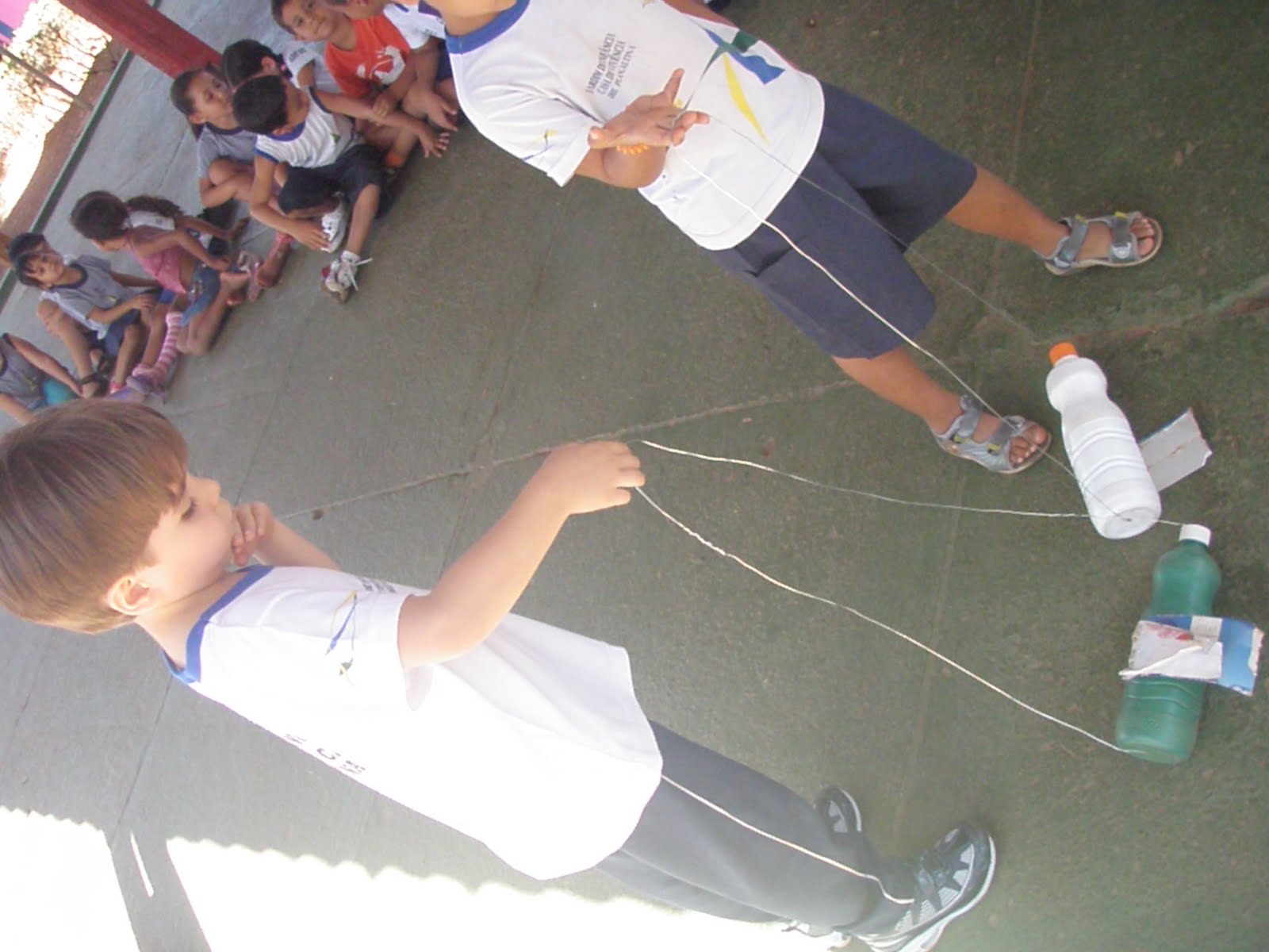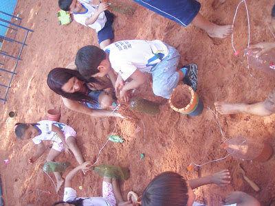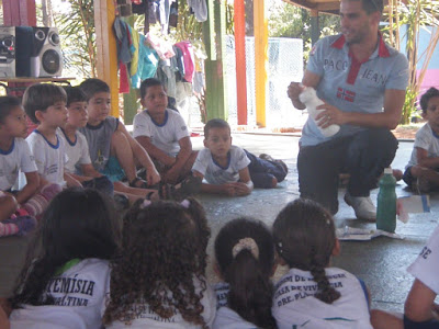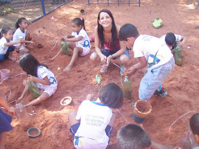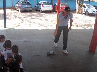 Enquanto o papai Edson orientava e auxiliava as crianças que trouxeram garrafas( pet ou de água sanitária) juntamente com a tia Nice, a tia Rô organizava um rodízio para a utilização(brincadeira)dos brinquedos produzidos com as crianças que não haviam trazido o material.