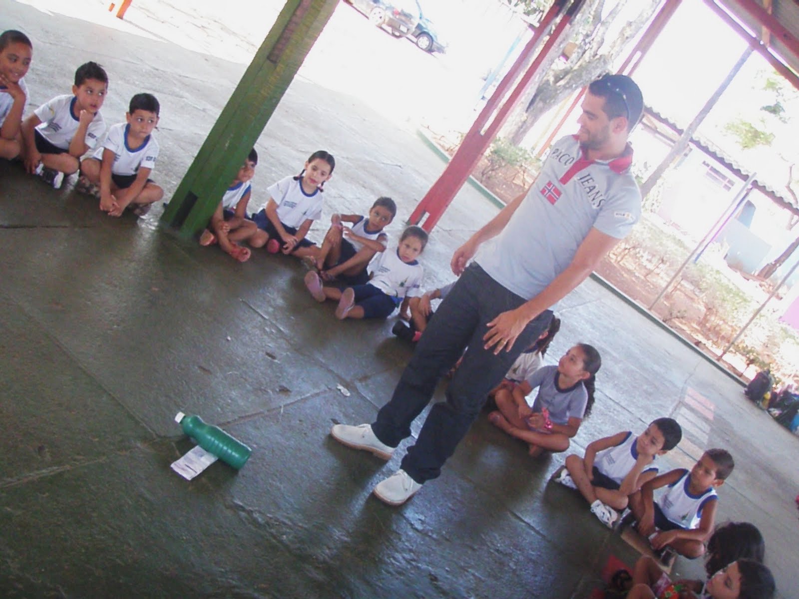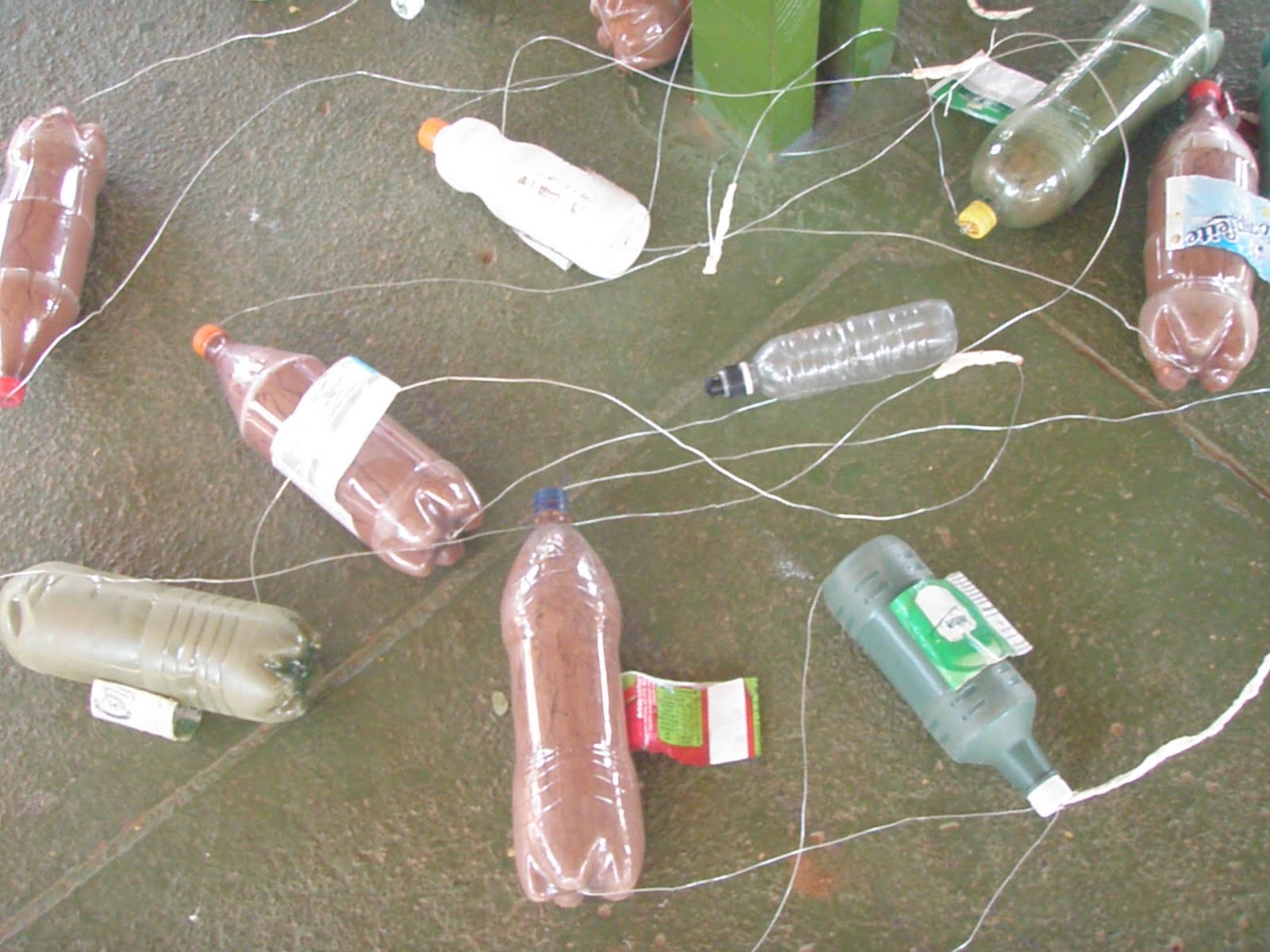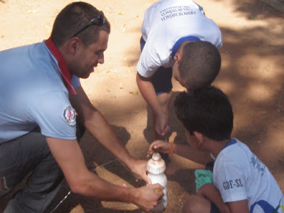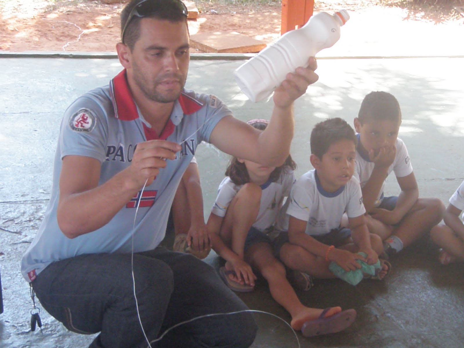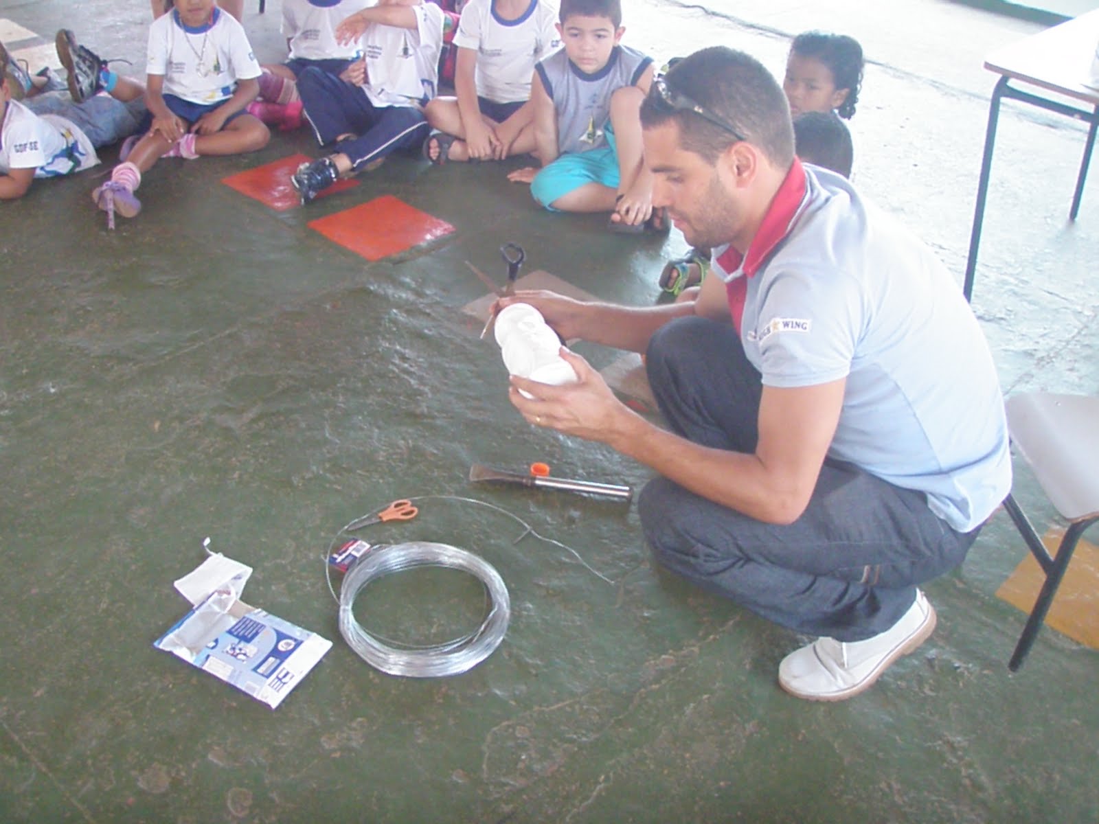 Depois o próprio Edson demonstrou como foi feito o primeiro exemplar na prática, orientando as crianças para a necessidade de um adulto acomanhar o processo de fabricação já que seria necessário cortar o arame, perfurar a garrafa, coisas que somente adultos podem fazer para que a criança não se machuque...