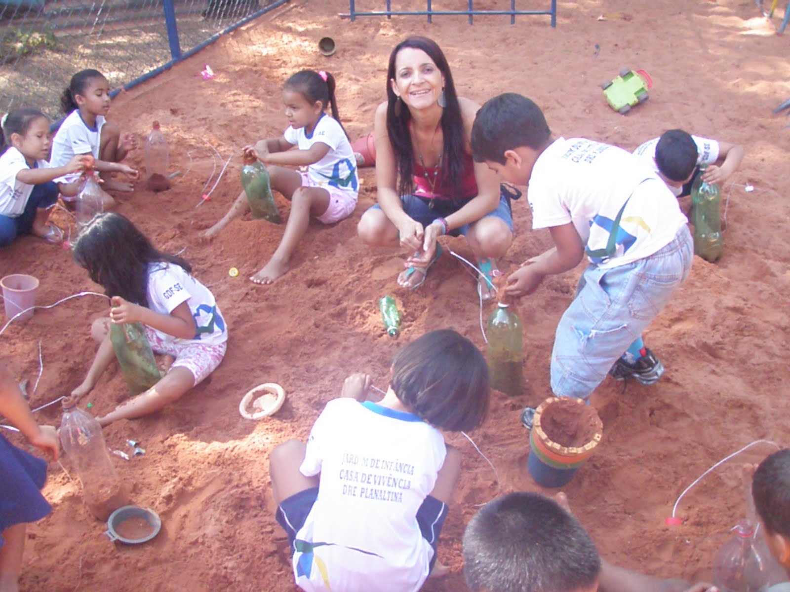 Foi necessário auxiliá-las a encher as garrafas com areia úmida pois eram muito grandes...