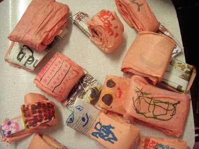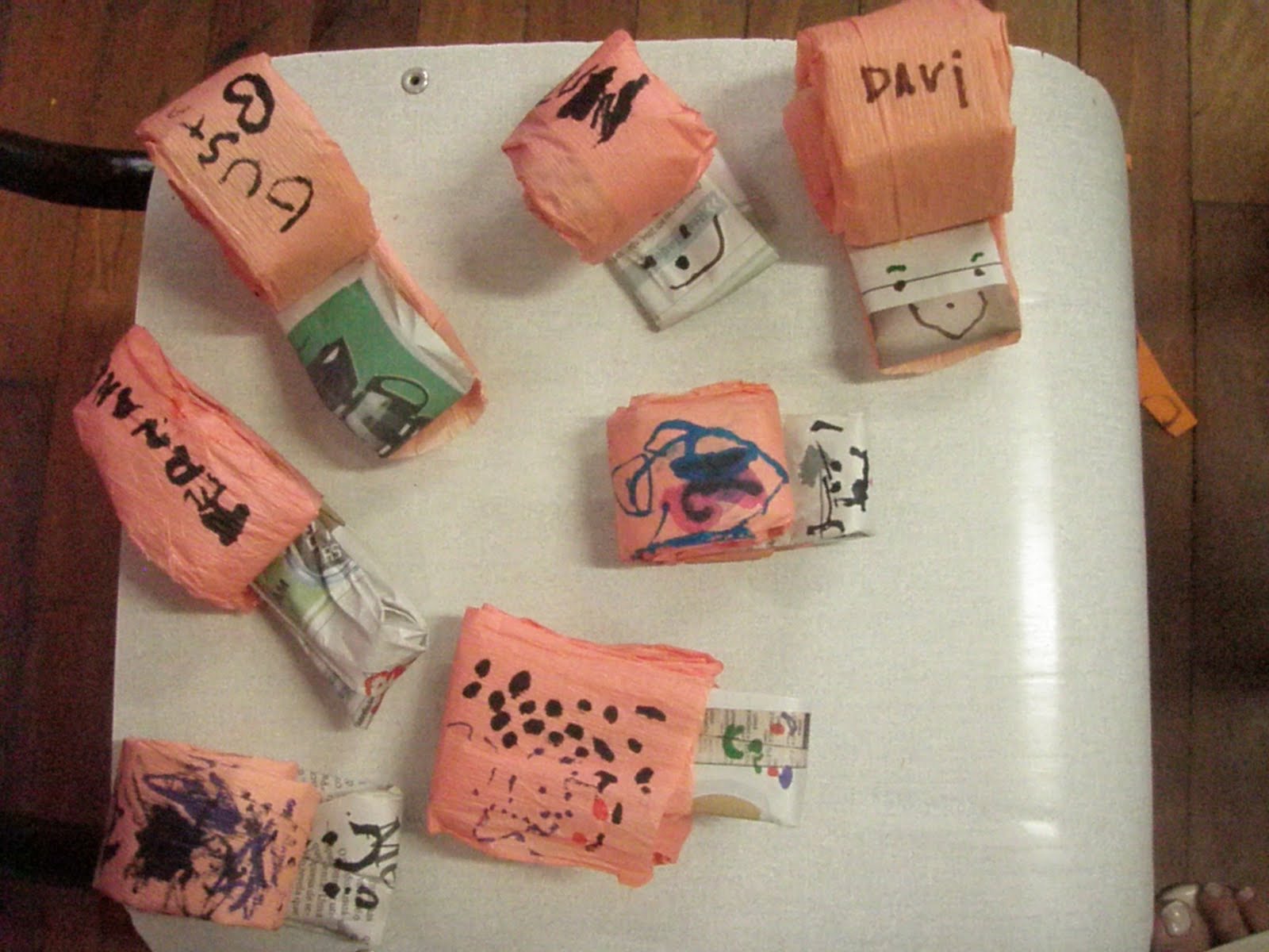 ***PS: para que pudessem ficar mais tempo expostas, furamos um buraquinho atrás de cada saquinho, assim as folhinhas que ainda estivessem verdes, poderiam evaporar sem mofar...aparentemente deu certo, as bonequinhas estão há um bom tempo na sala, as crianças as usam para pesquisar letras dos nomes dos colegas e os seus, uma festa!