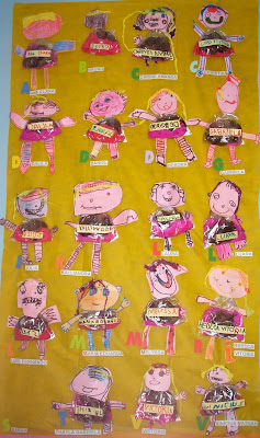 Depois, colamos em ordem alfabética, associando primeiras letras aos nomes das crianças...