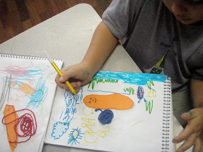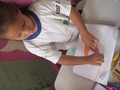 Cada um foi liberando sua criatividade como quis, mas já no início perceberam que tinham que "planejar" seus pequenos projetos de desenhos para recortar e colar adequadamente. Aí falamos sobre planejar, antecipar as ações, saber o que está sendo realizado antes de realizar...foi uma discussão gostosa...