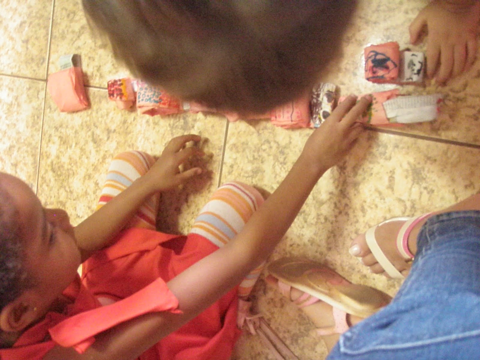 "Ai, tia vou precisar de mais papel amarelo"... o que levou-nos a deixar uma sacolinha de papéis diversos disponível para que tivesse novas ideias...