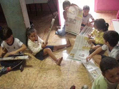 Brincamos muito com a folha aberta do jornal executando equilíbrios e movimentos com as duas mãos segurando a folha...depois enrolamos no sentido do comprimento...
