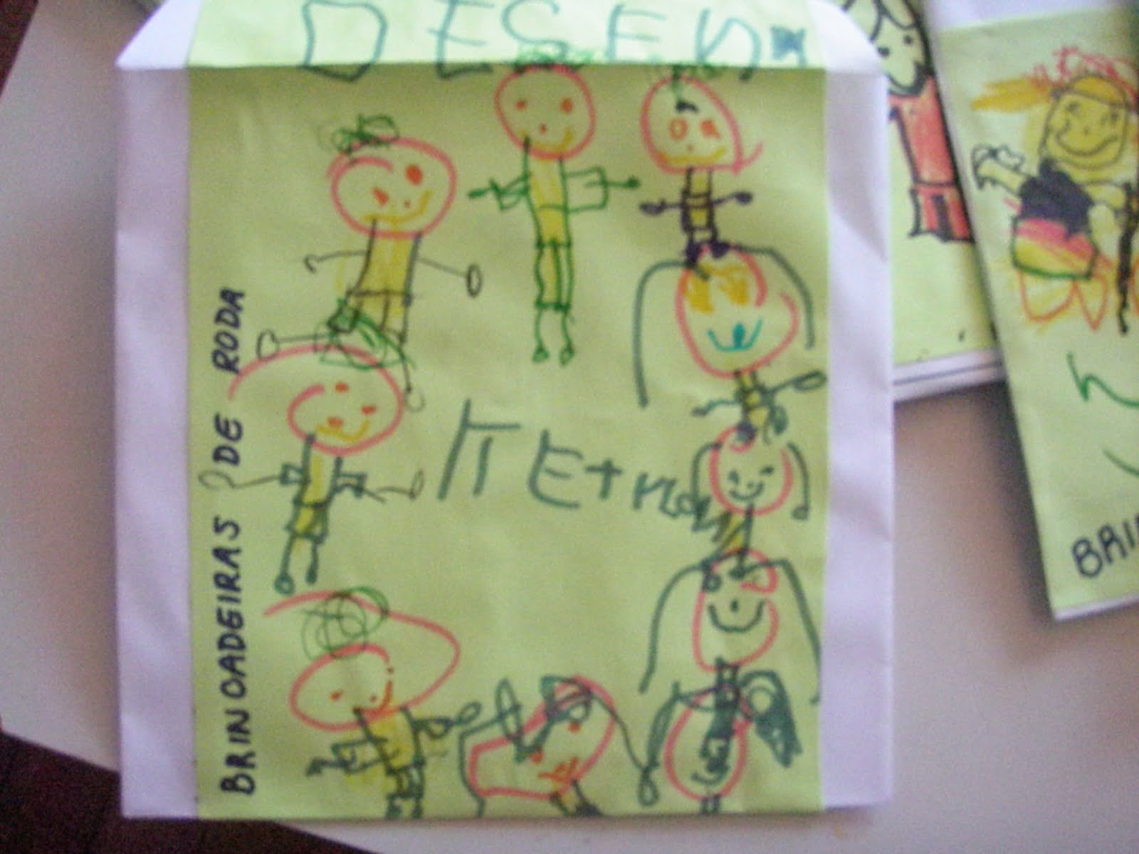 Para que os pais das crianças pudessem levar o Caderno de Atividades produzido no primeiro semestre, na Reunião do terceiro bimestre, as crianças fizeram a seguinte arte: