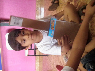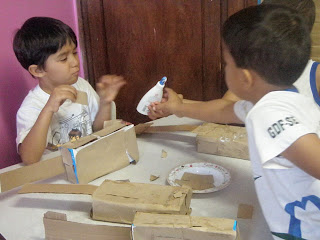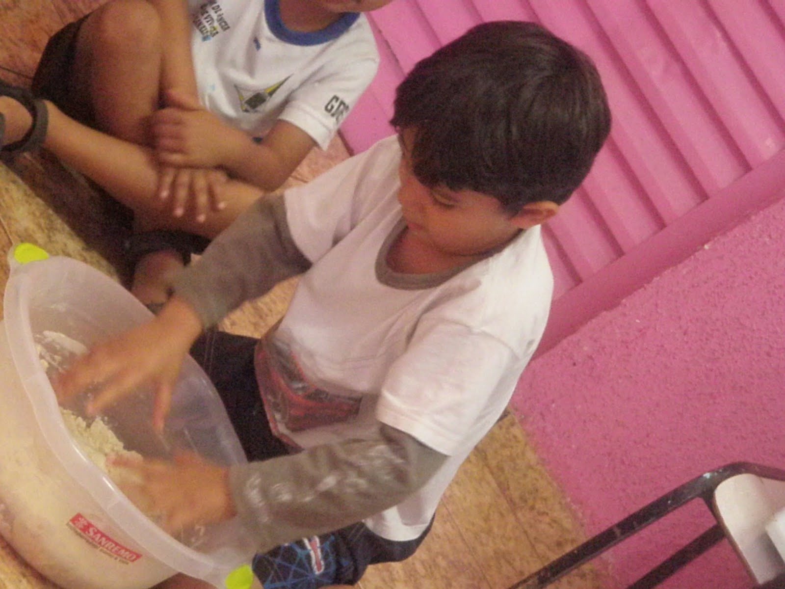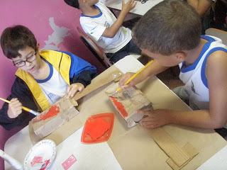 Os meninos usaram papelão, papel pardo para a base das guitarras/violão...