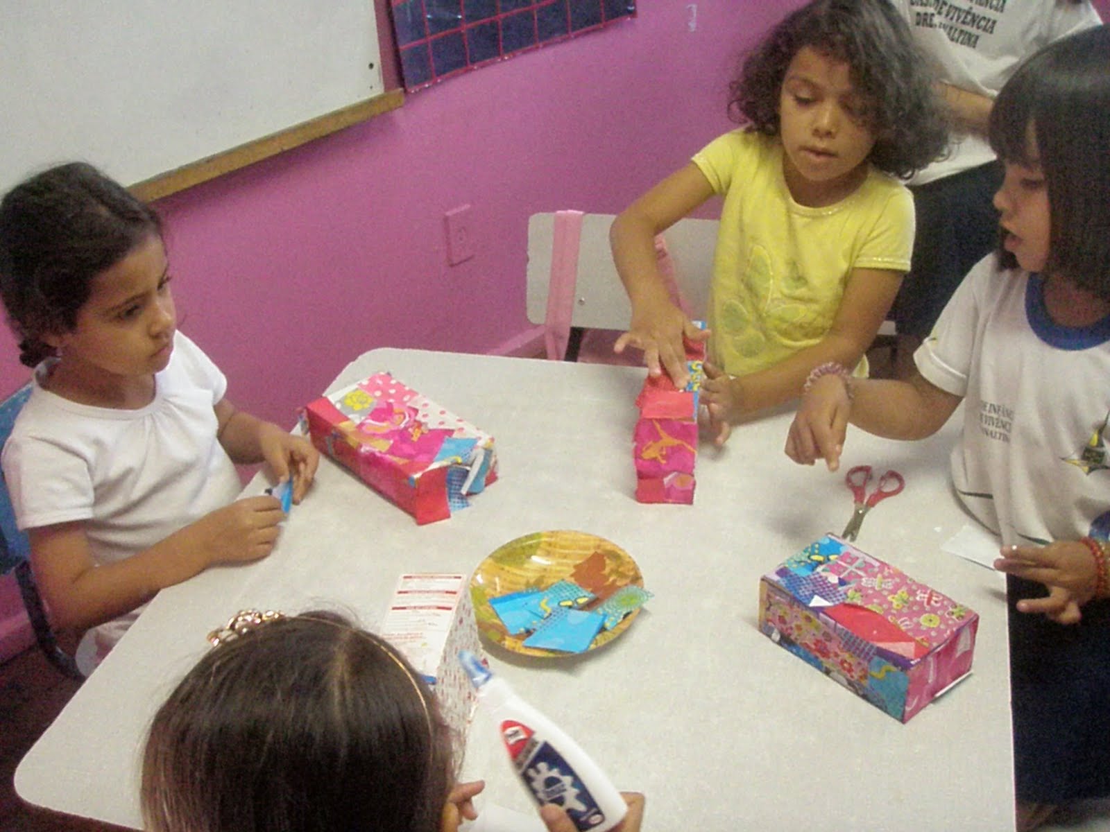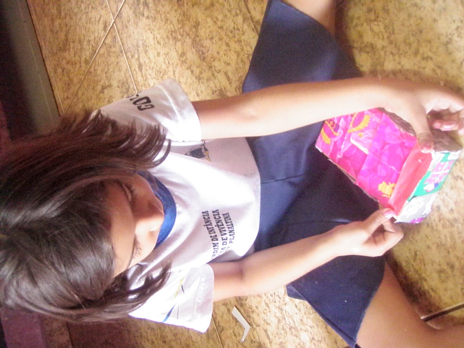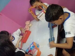 Encapamos com papéis coloridos, de presente e tecidos as futuras bolsas...