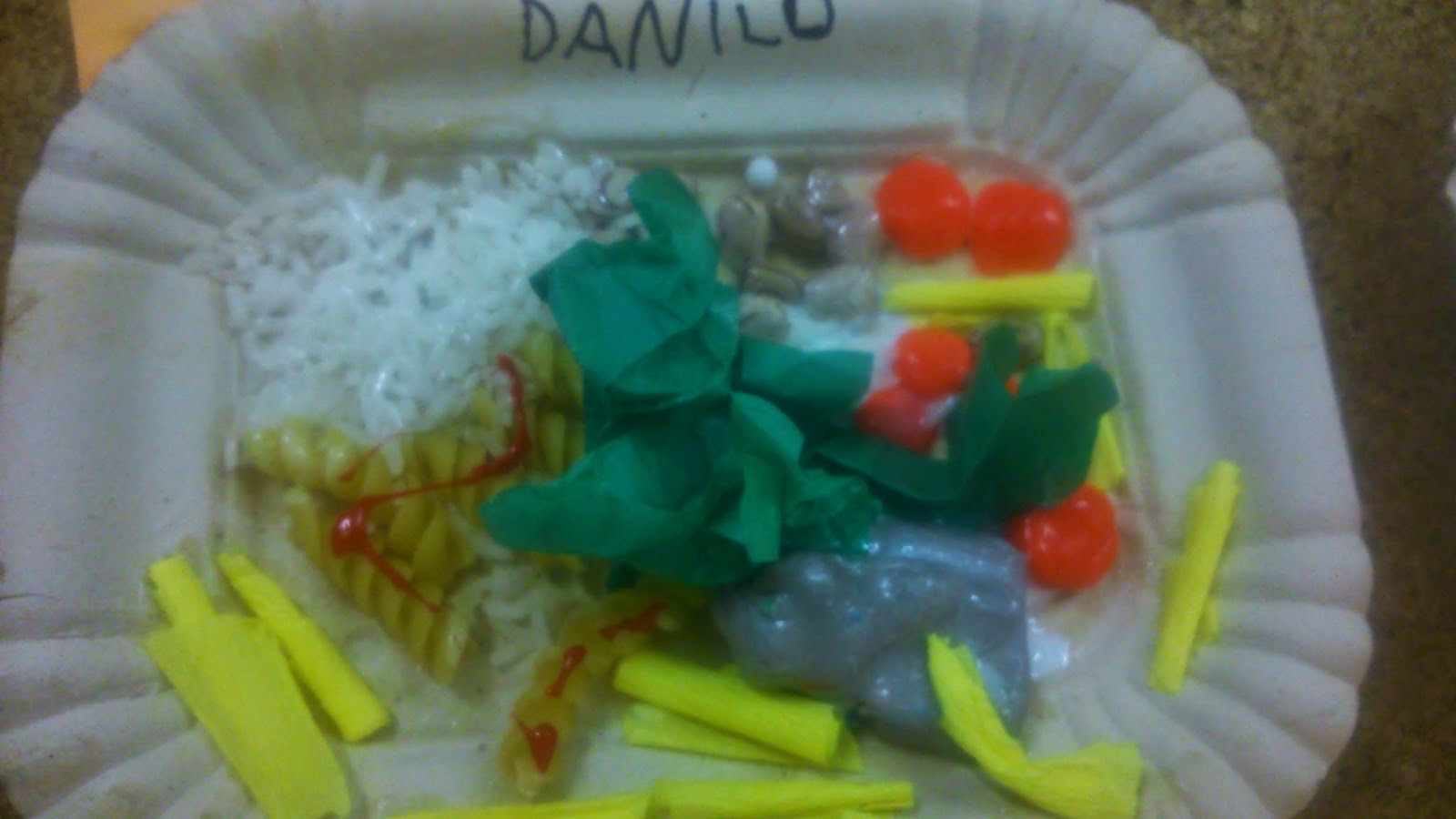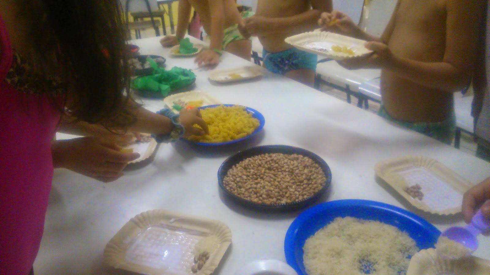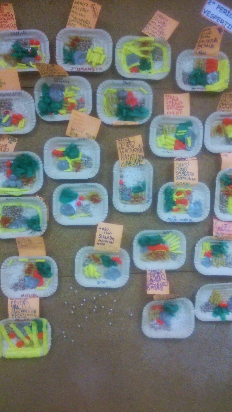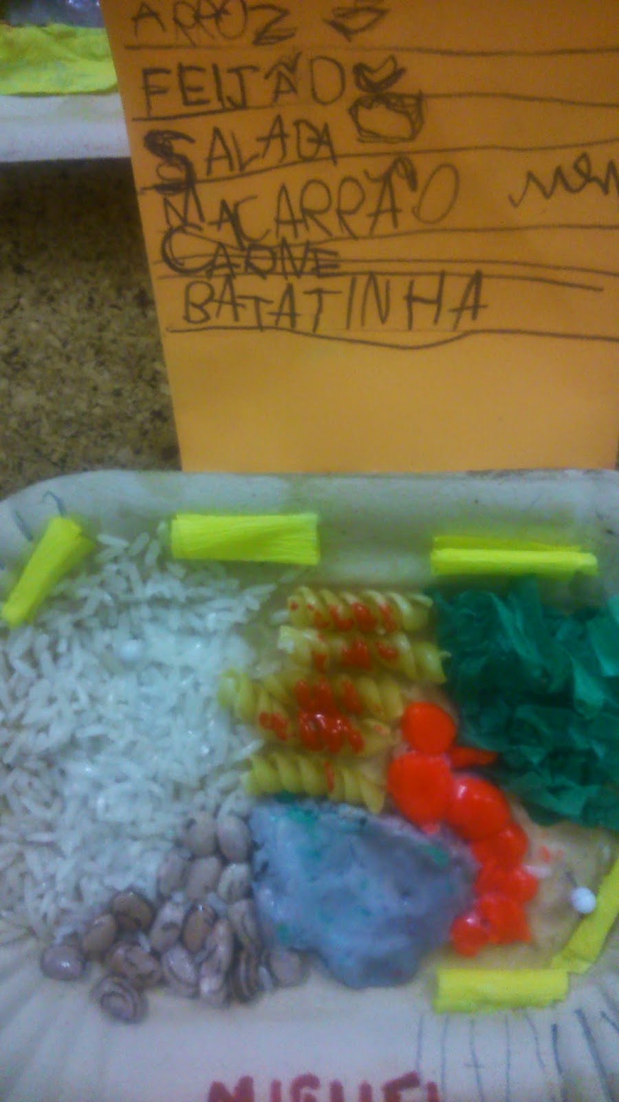 Analisamos e escrevemos coletivamente os nomes de cada prato, mas alguns ainda escreveram como desejaram!Enquanto fomos para a piscina e jogos os pratinhos receberam um camada de cola branca por cima pra que os alimentos ficassem mesmo colados!