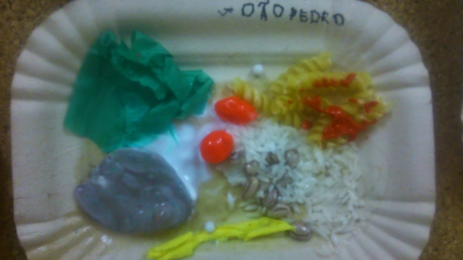 Na entrada da FILA a professora colocou um pouco de "molho"(cola branca) para que os alimentos crus ficassem grudados no prato!