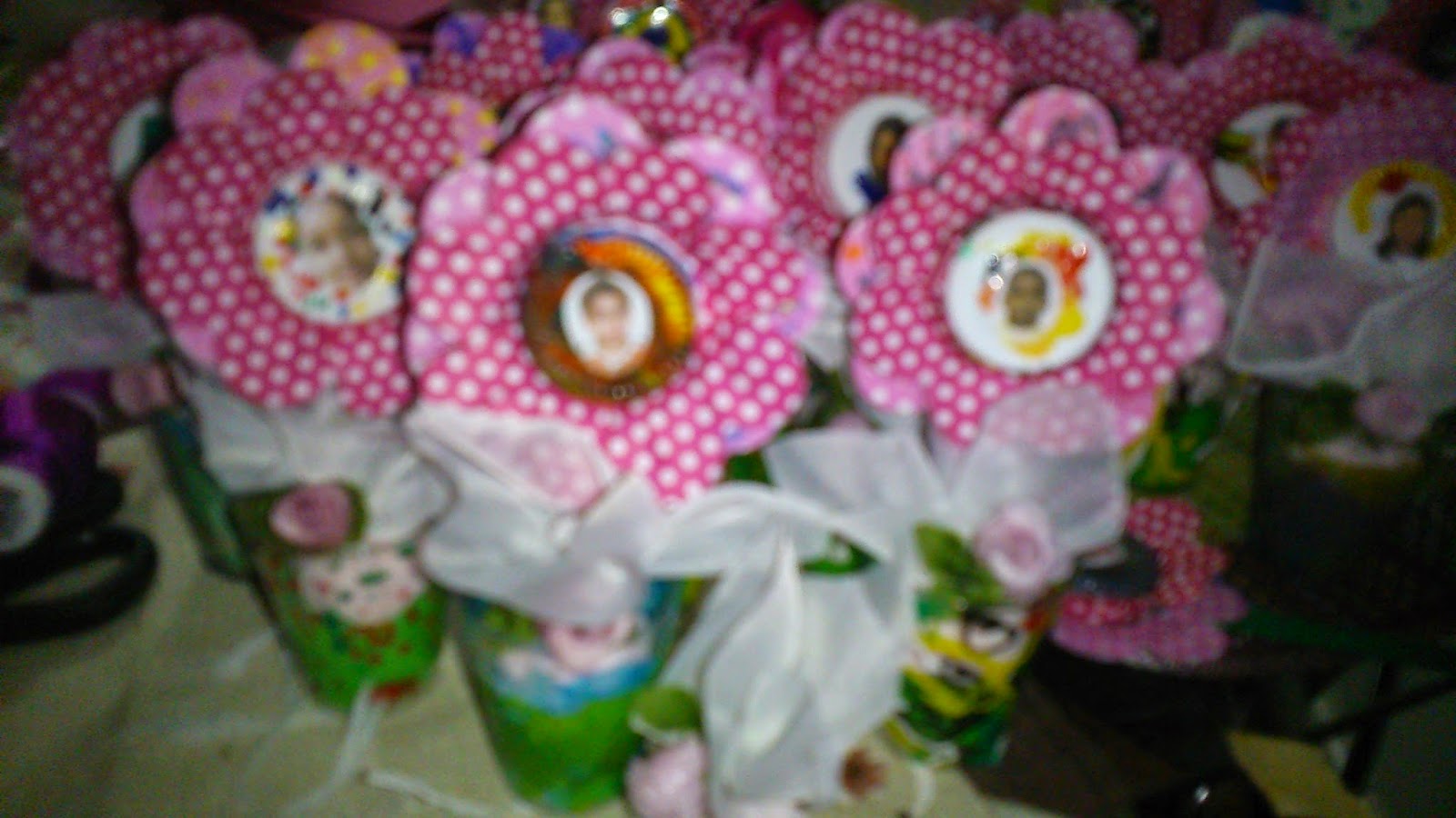Tampinha de leite colorida com cola colorida pelas crianças e uma mini foto dos pimpolhos...