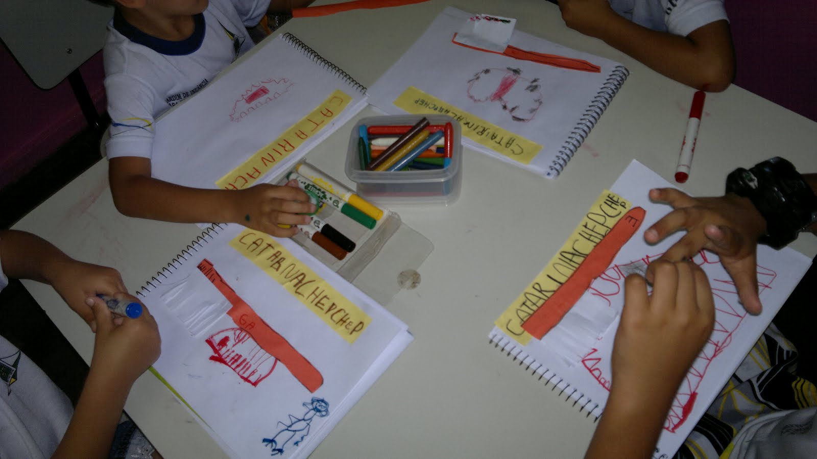 No caderno cada um registrou quem estava no seu grupo e como ficou a arte do papel...