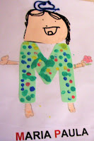 Os pinguinhos na letra do nome foi também idéia da Any Arteira, ai nós incrementamos usando a letra como corpo e completando o desenho com os membros, cabeça com lápis de cor. usamos ainda barbante como cabelo...Foi capa de um envelope para os informes da Reunião de Pais.