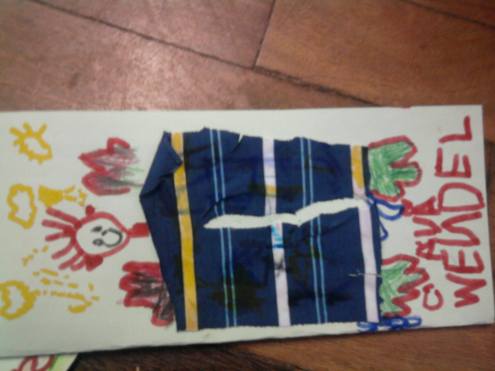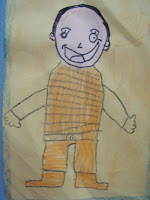 Desenhamos a cabeça com pincel atômico preto em chamequinho pele, recortamos e colamos em outra folha de chamequinho amarelo; daí foi só completar o desenho com giz de cera.