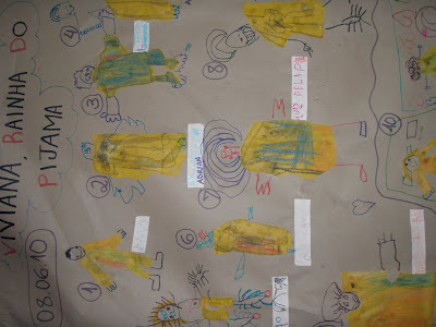 Em sala, cada criança desenhou e recortou o seu pijama em TNT amarelo.