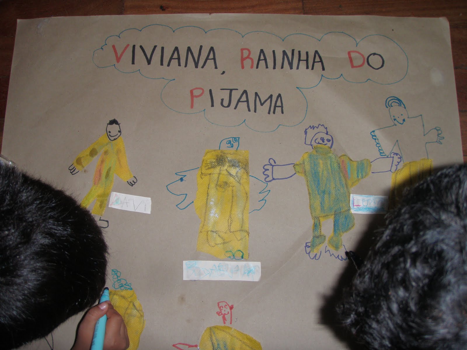 As crianças desenharam a si mesmas como príncipes e princesas em chamequinho amarelo e recortaram os retratos. Inspirados num trabalho da Any Arteira com a turminha dela, colamos em cartolina dupla face e pigamos cola colorida de várias cores! Ficaram lindos e foram colados nos envelopes da APM!
