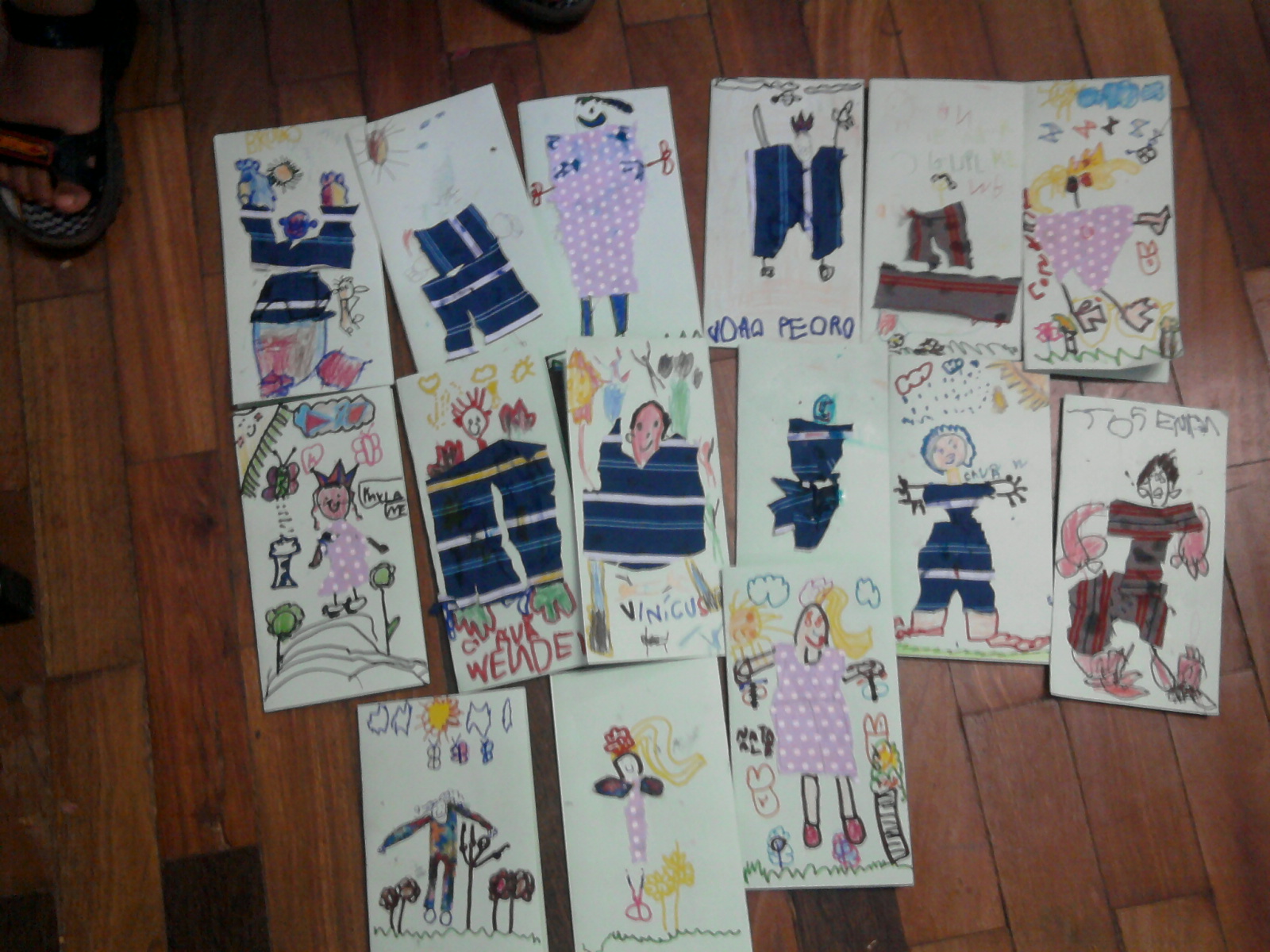 Usando pincéis, giz de cera e canetinhas desenharam e identificaram-se escrevendo seus nomes em fichinhas...