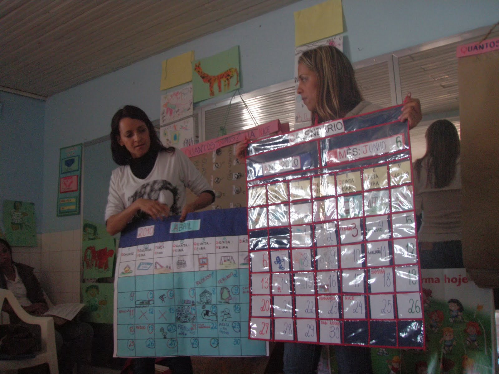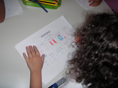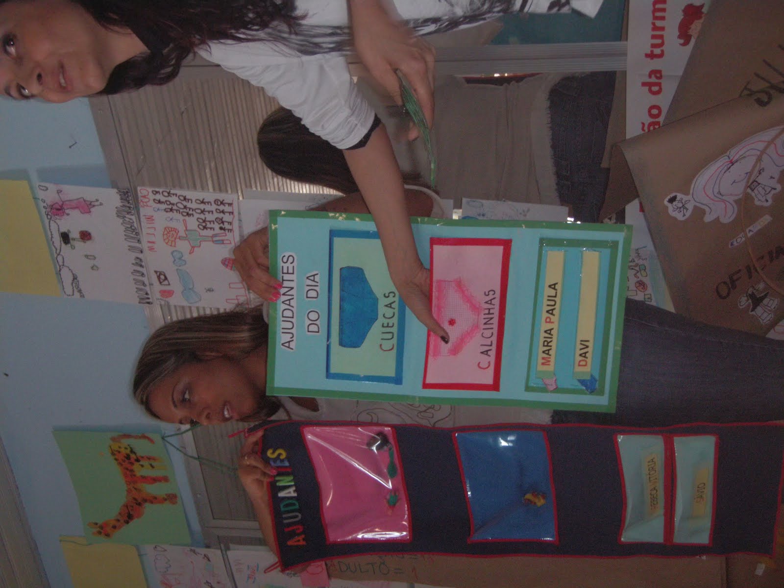 -Colocamos uma cadeira e o grupo do dia(1, por exemplo) vai até o "mini quadro de pregas" que fica na parte superior do quadro e monta sem nenhuma interferência o nome da escola.
