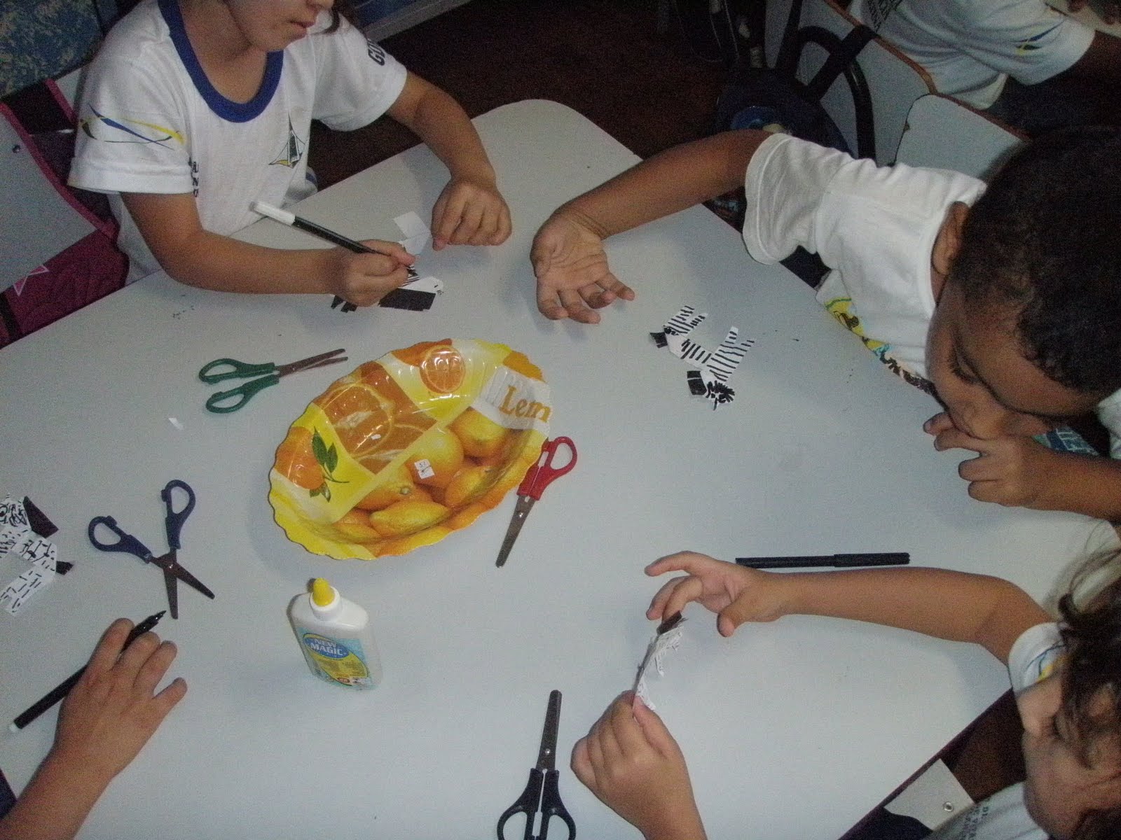 As crianças ainda completaram a dobradura após colar uma parte na outra, com desenhos das listas pretas e dos elementos da carinha da zebra;