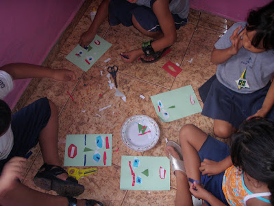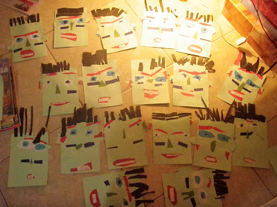 -As crianças dobraram as pontas de um quadrado marrompara fazer a juba;