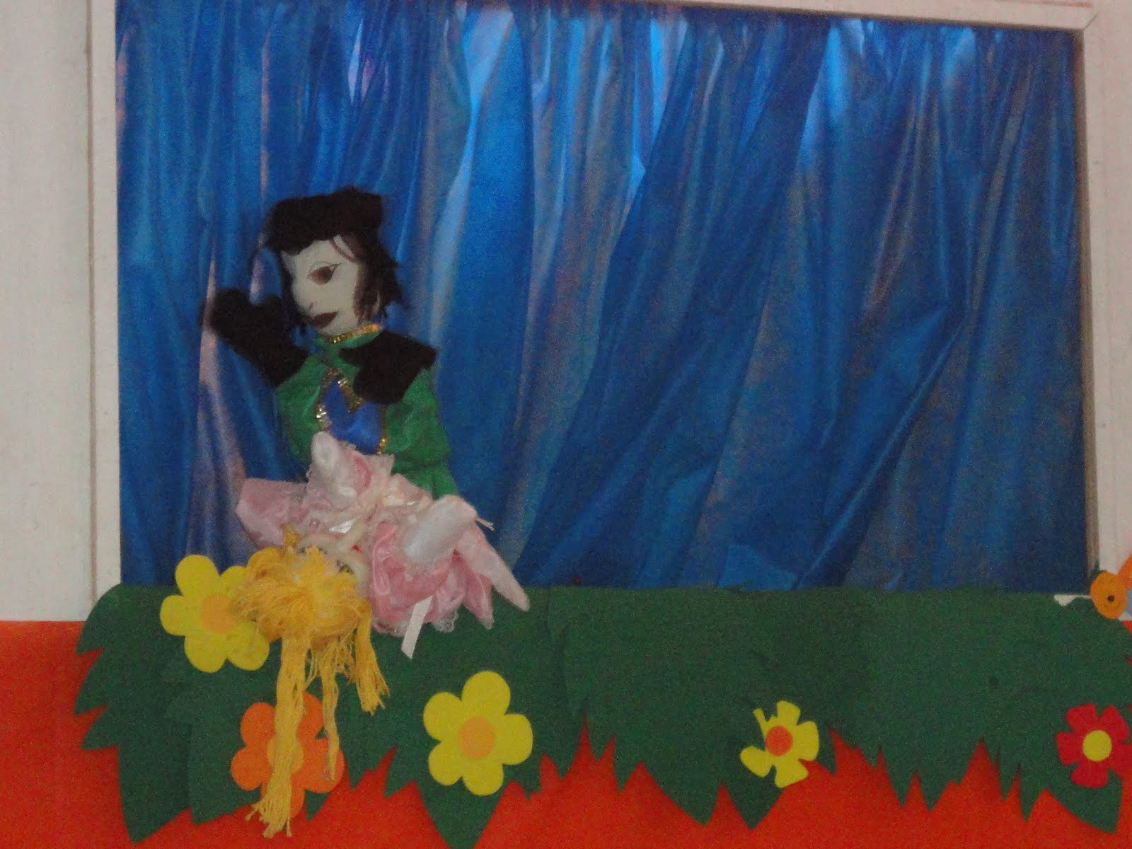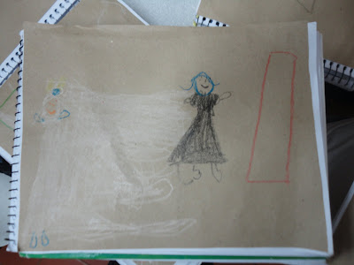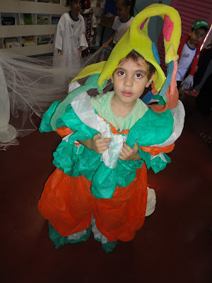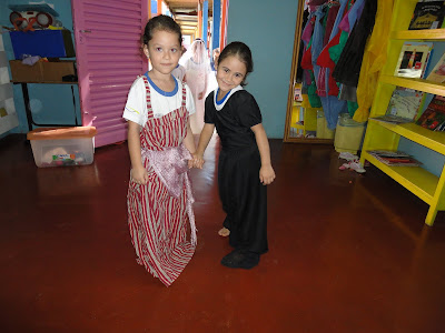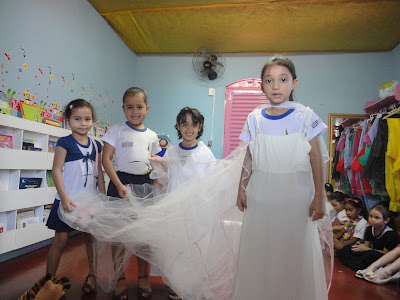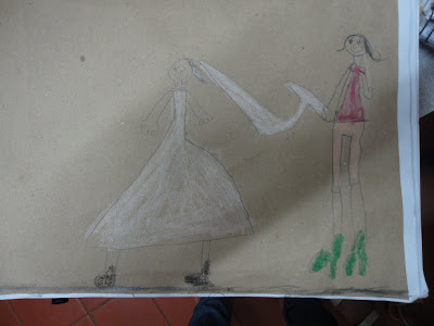 Começamos com os Convites que as crianças fizeram desenhando a tia Nice e recortando sua roupa com papel de presente de bolinhas!